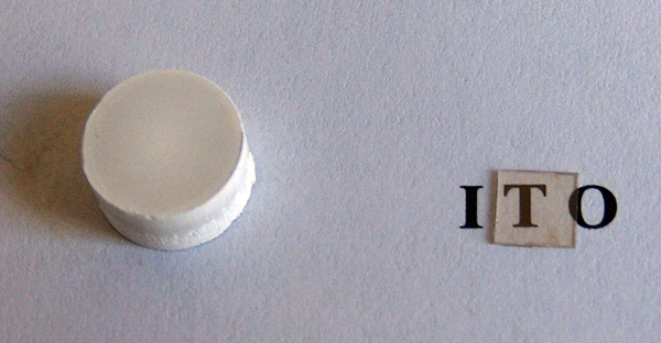 左:氧化铟锡的固体。右:镀有氧化铟锡的玻璃。(图片来自科学公园)